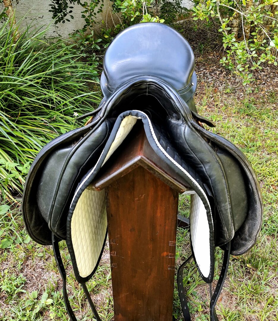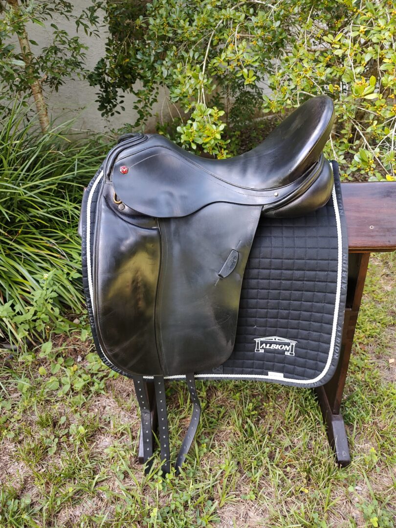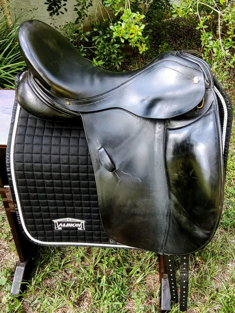 Older model Albion SLK saddles are deep-seated, narrow-twist dressage saddles designed with German Olympian Klaus Balkenhol, featuring traditional wooden trees and wool-flocked panels.