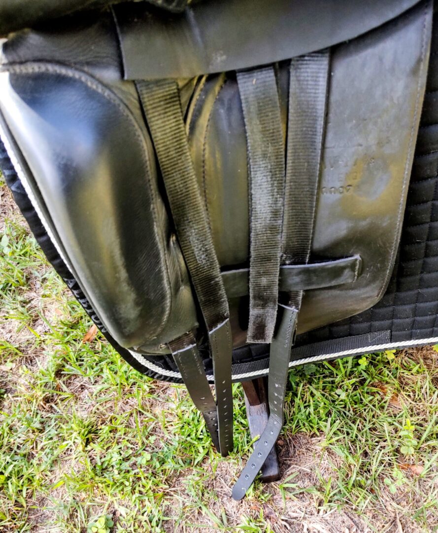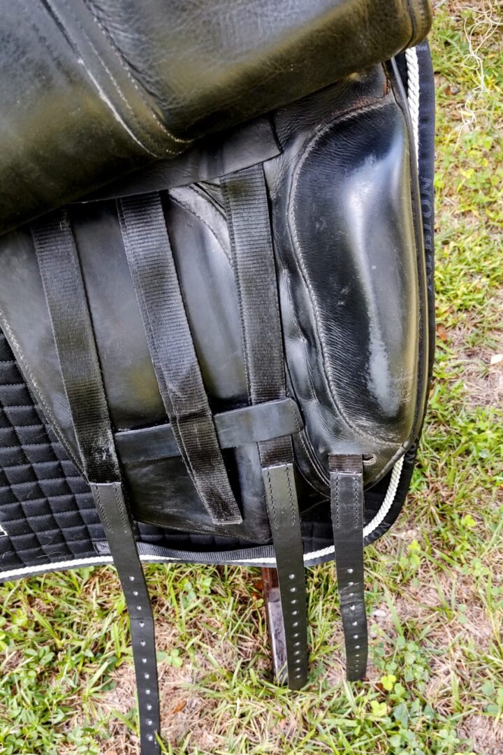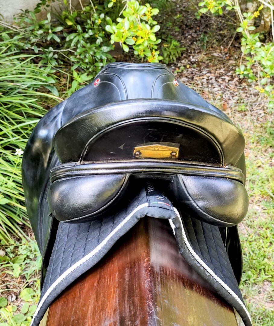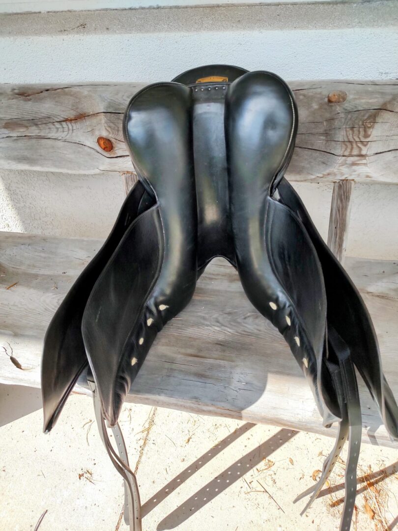 Older model Albion SLK saddles are deep-seated, narrow-twist dressage saddles designed with German Olympian Klaus Balkenhol, featuring traditional wooden trees and wool-flocked panels.