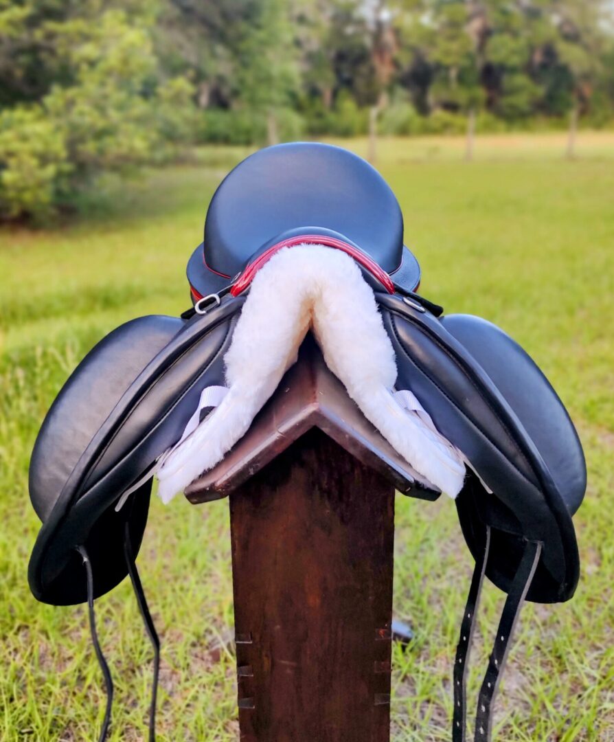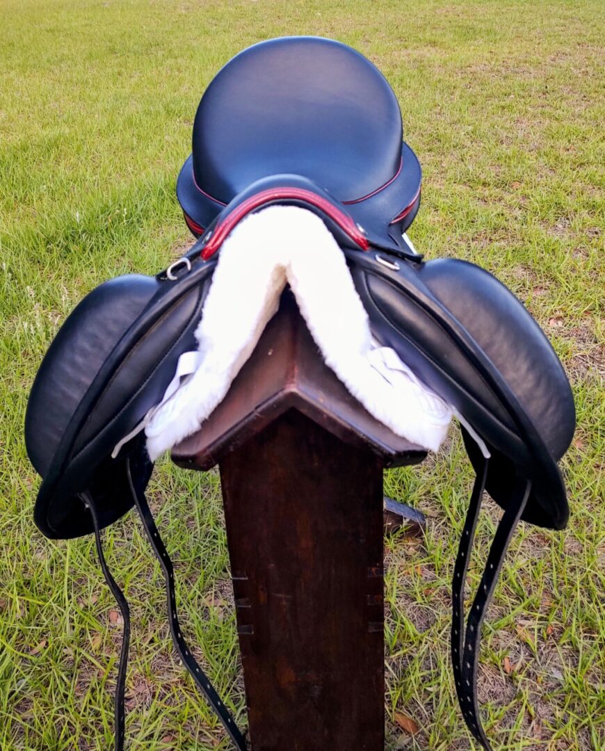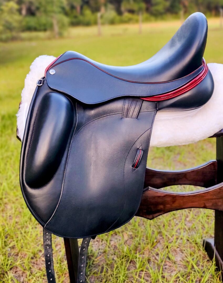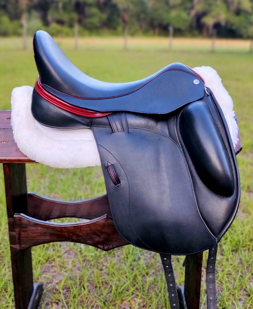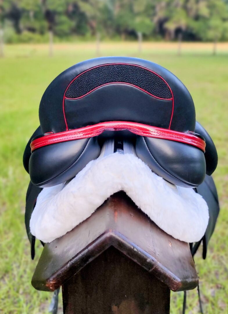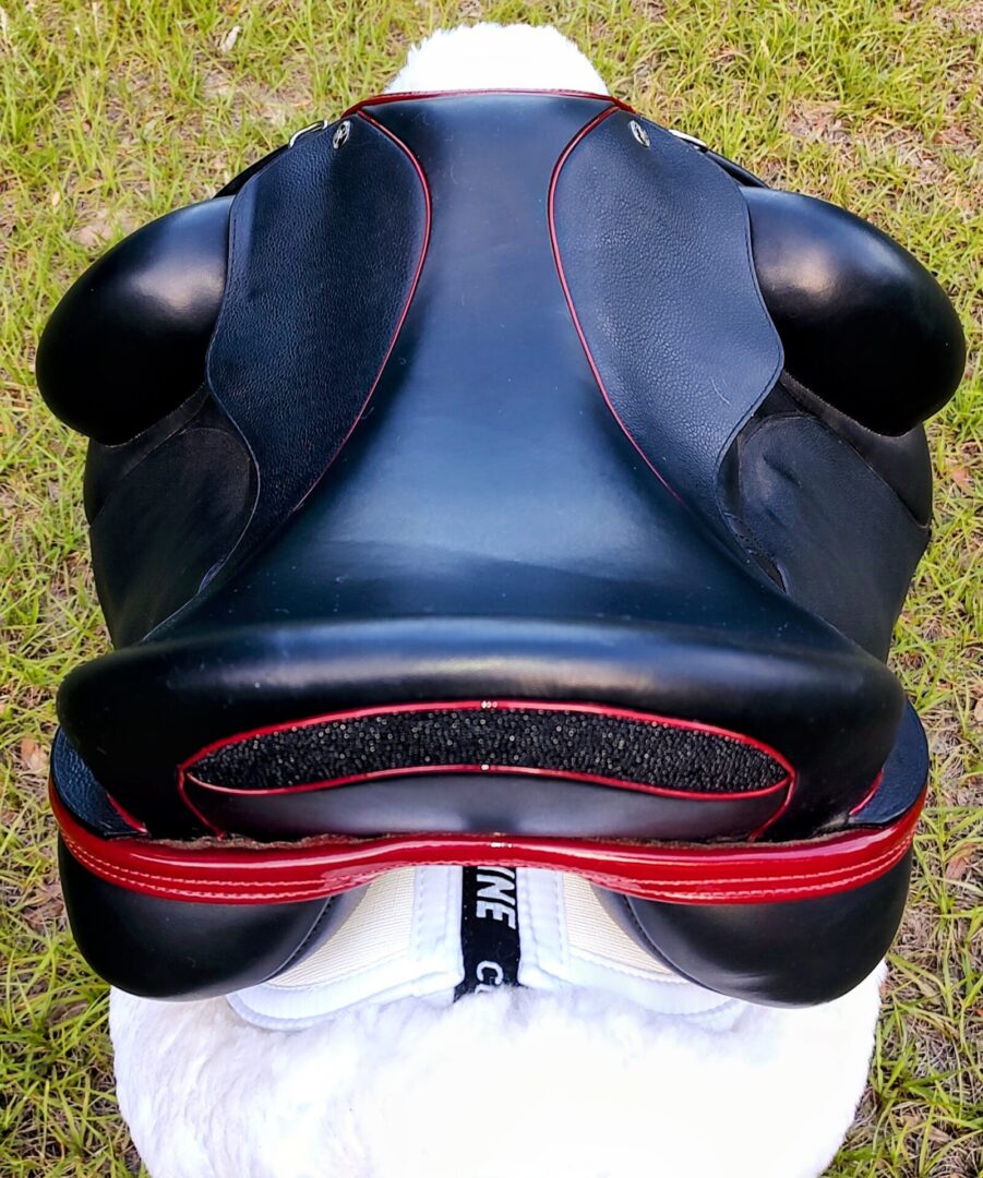 Cantle inset is the 1/2 inset style and is black stingray with red patent welt detailing. This ‘pre-loved’ Leggero is beautiful and is in perfect condition. New Patrick Leggero saddles retail for $6,800.