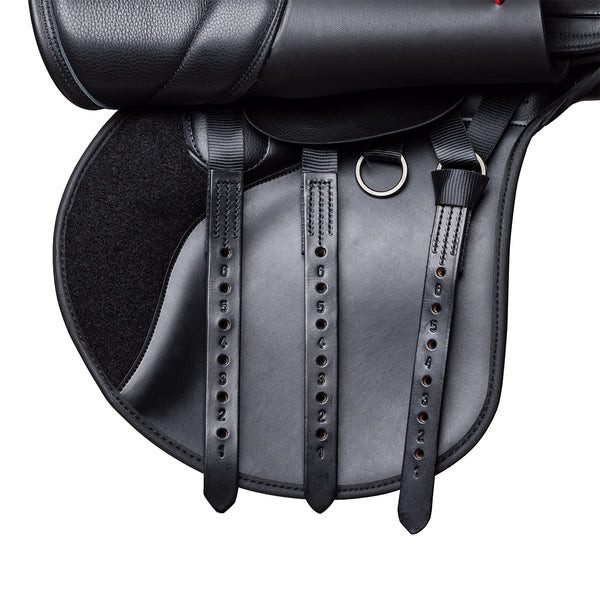 - A secure seat with a lower cantle doesn’t restrict the jumping position and allows you to maintain your center of balance over the fence